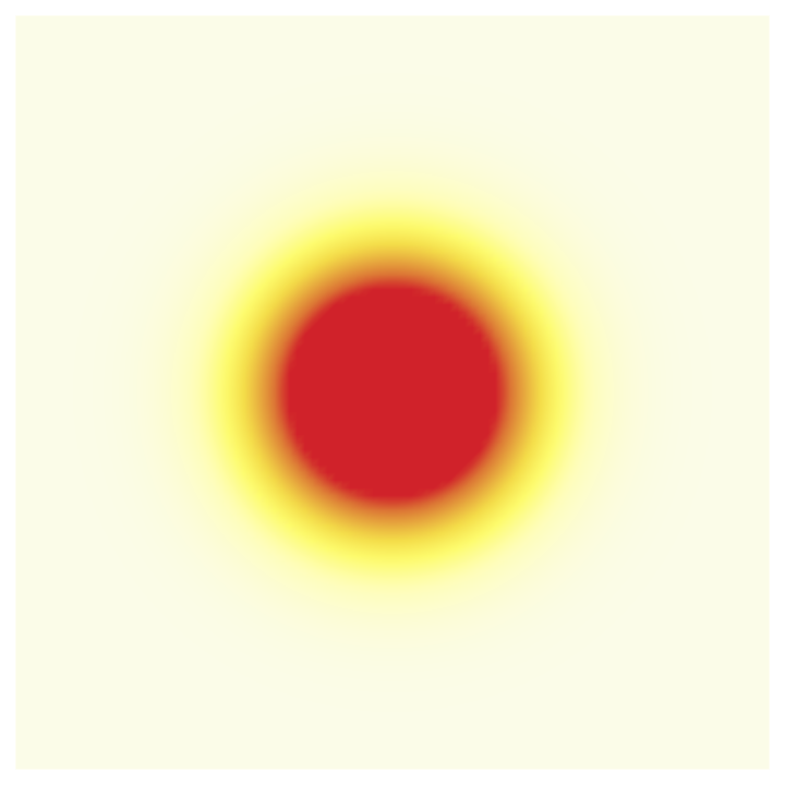 \begin{equation} E(r) = E_0 * e^{-\frac{r^2}{w_0^2}} \end{equation}Where \(E_0\) is the field amplitude at the center, \(w_0\) is called the "beam waist", which is the radius after which the field falls to \(1/e\) its initial value, and \(r\) is the distance from the center of the beam. If we plotted the field at \(t=0\), it should look like this: